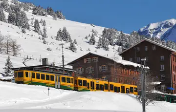 Admirer les paysages naturels des Alpes de l'Albula depuis les fenêtres d'un train de croisière est une belle façon de passer une journée. L'Engadine Express part de Landquart, grimpe une pente raide jusqu'à Klosters, traverse le tunnel de la Vereina (le plus long tunnel des Chemins de fer rhétiques suisses) et serpente à travers Zernez et Saint-Moritz. Vous verrez des forêts luxuriantes, des lacs gelés, des sommets dentés et peut-être même des animaux sauvages !